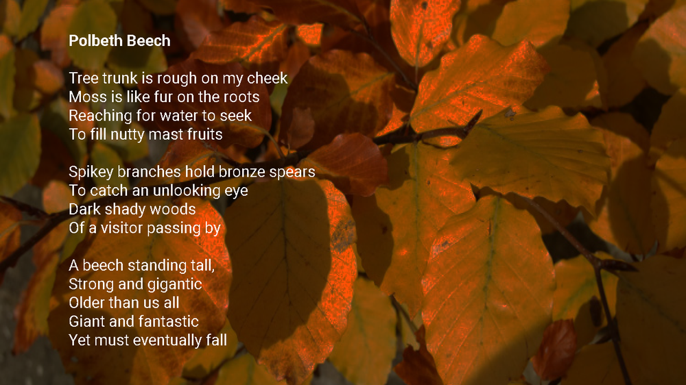 On a bright winter's day, we collected words to describe the huge old trees in the community garden. Then we built sentences to give the feel of the trees: